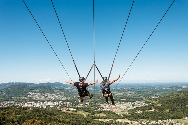 Com uma extensão impressionante de 2,5 quilômetros, a tirolesa parte de uma altitude de 330 metros do Welt Platz, um parque com vistas panorâmicas que abrangem todo o Vale do Caí. Os aventureiros serão levados a uma velocidade que pode chegar a 100 km/h, enquanto desfrutam de uma experiência única sobre as belas paisagens da região.