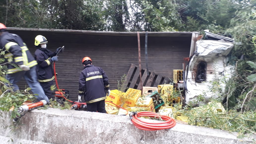 Marcelo Pereira, 36 anos, conduzia o caminhão VW/8.150 carregado de bebidas que tombou em uma curva do km 91 da BR-116. O passageiro Renato Bueno Junior; de 23 anos foi socorrido e encaminhado para o hospital com escoriações leves.