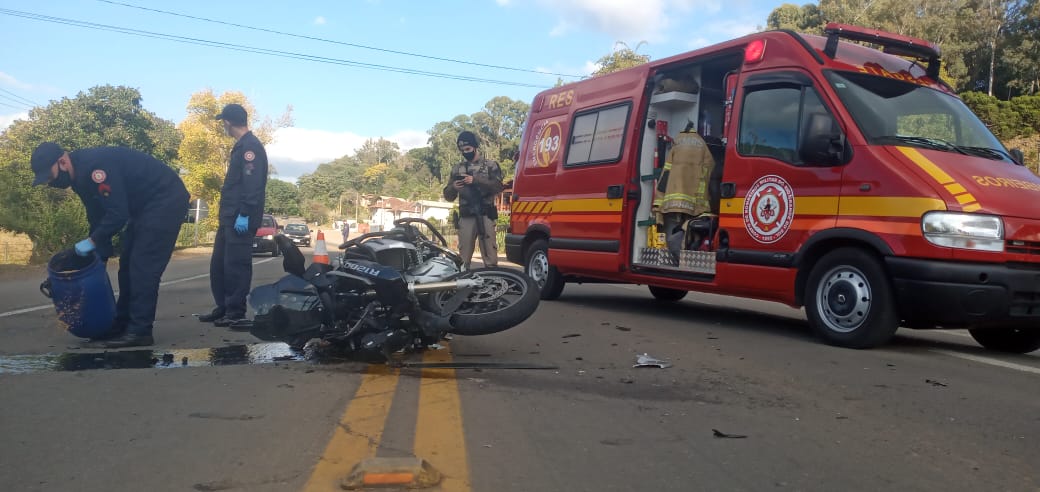 Acidente aconteceu no Km 113 da BR 116, próximo de uma das entradas do Bairro Progresso Por volta das 15h30 desta segunda-feira (17) as equipes de resgate foram acionadas para atender um acidente de trânsito no km 113 da BR 116, envolvendo uma moto de grande porte e um veículo de passeio.