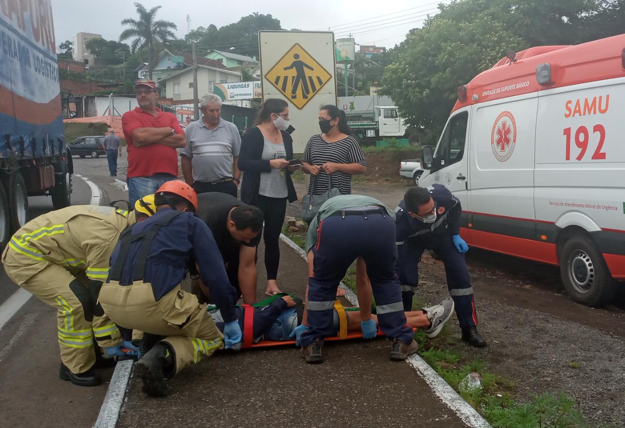 Bombeiros e Samu de São Marcos atenderam esta manhã a um acidente de trânsito envolvendo uma moto na altura do km 115 da BR 116, bem no centro de São Marcos.