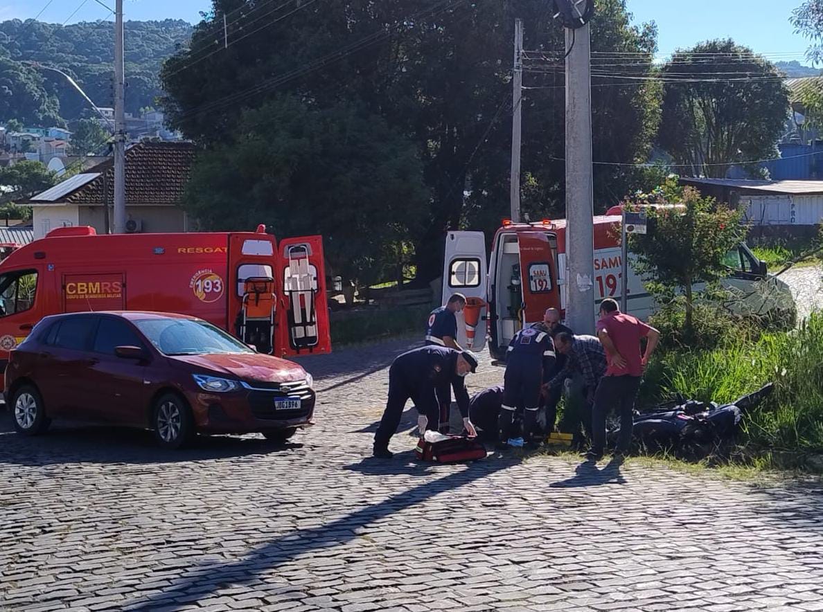 A colisão ocorreu no cruzamento das ruas Osvaldo Aranha e Augusto Catafesta, mobilizando equipes do SAMU e do Corpo de Bombeiros. O motociclista foi encaminhado ao Hospital São João Bosco com um ferimento na cabeça.