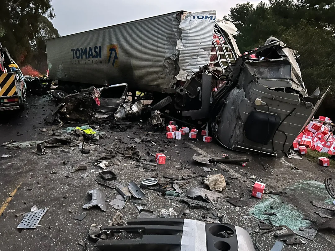 Na noite deste sábado, 4 de agosto, um grave acidente no quilômetro 13 da BR 116, em Vacaria, próximo à ponte do Rio Pelotas, matou um motorista e feriu outra pessoa. Três carretas e um caminhão prancha colidiram, bloqueando completamente o trânsito na rodovia.