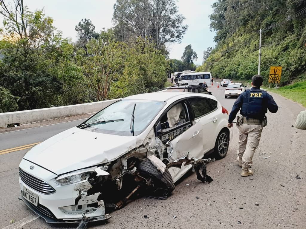 Os policiais rodoviários federais foram informados de um acidente na rodovia. Chegando ao local foi constatada uma colisão lateral e frontal envolvendo um Focus, emplacado em Flores da Cunha, e dois microonibus, com placas de Caxias do Sul e Feliz.