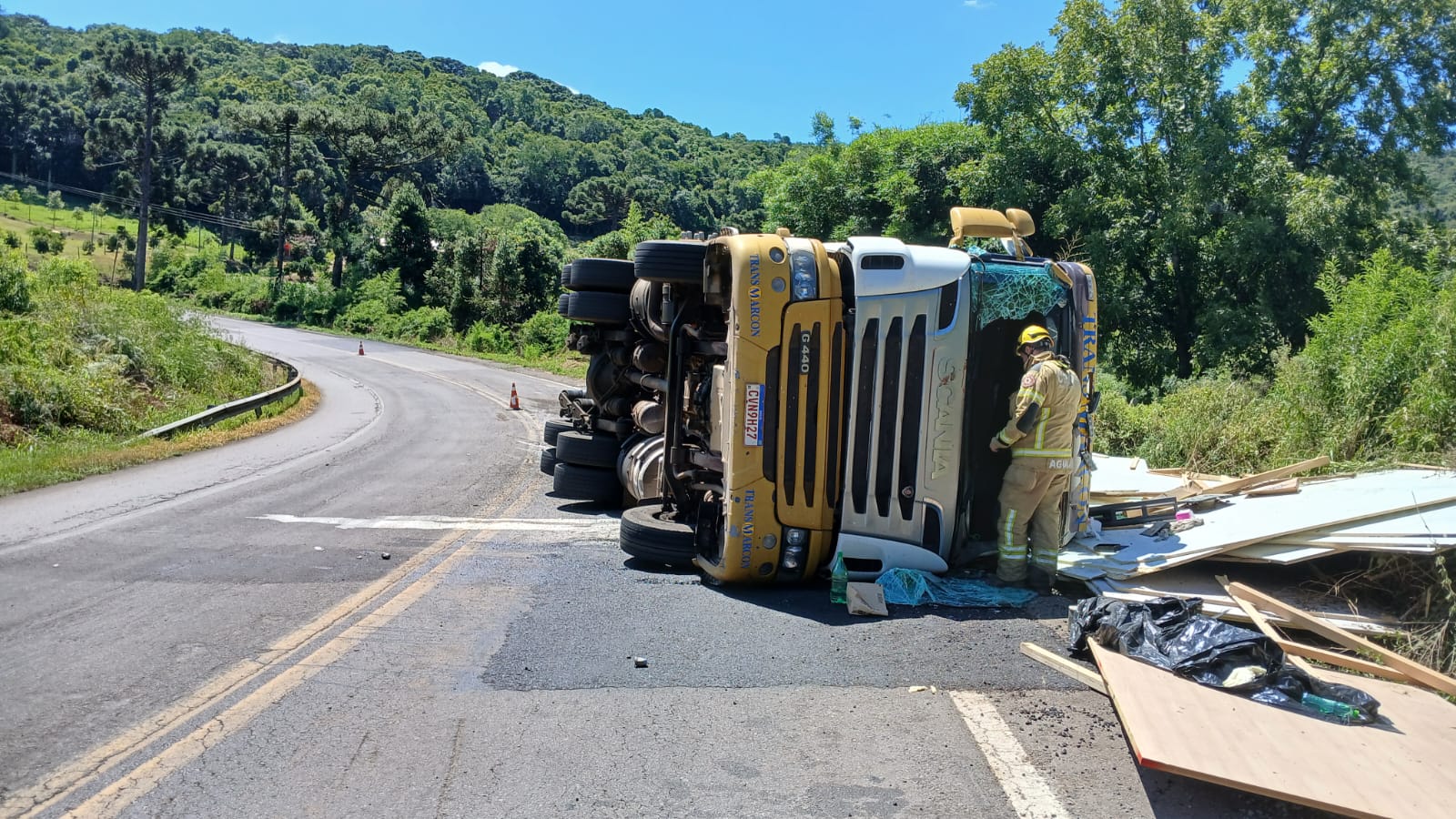 O caminhão, com placas de Santa Catarina, estava carregado com chapas de MDF que seriam entregues em uma empresa de móveis da cidade. O veículo tombou sobre a pista contrária à que seguia.