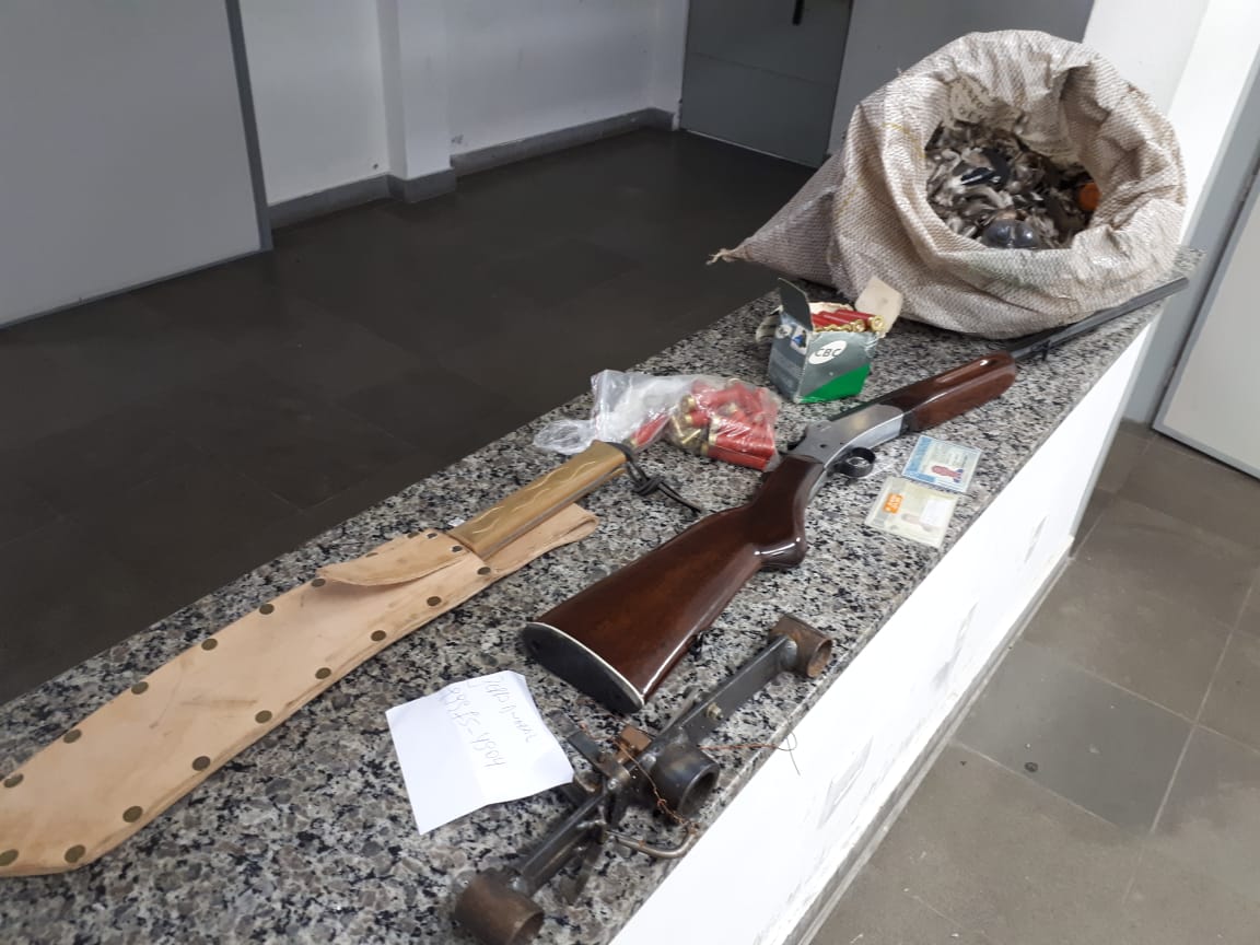 Na propriedade foi feita apreensão de uma espingarda cal. 28 e 41 munições do mesmo calibre, ainda um facão e dois aparelhos celulares em posse dos elementos.