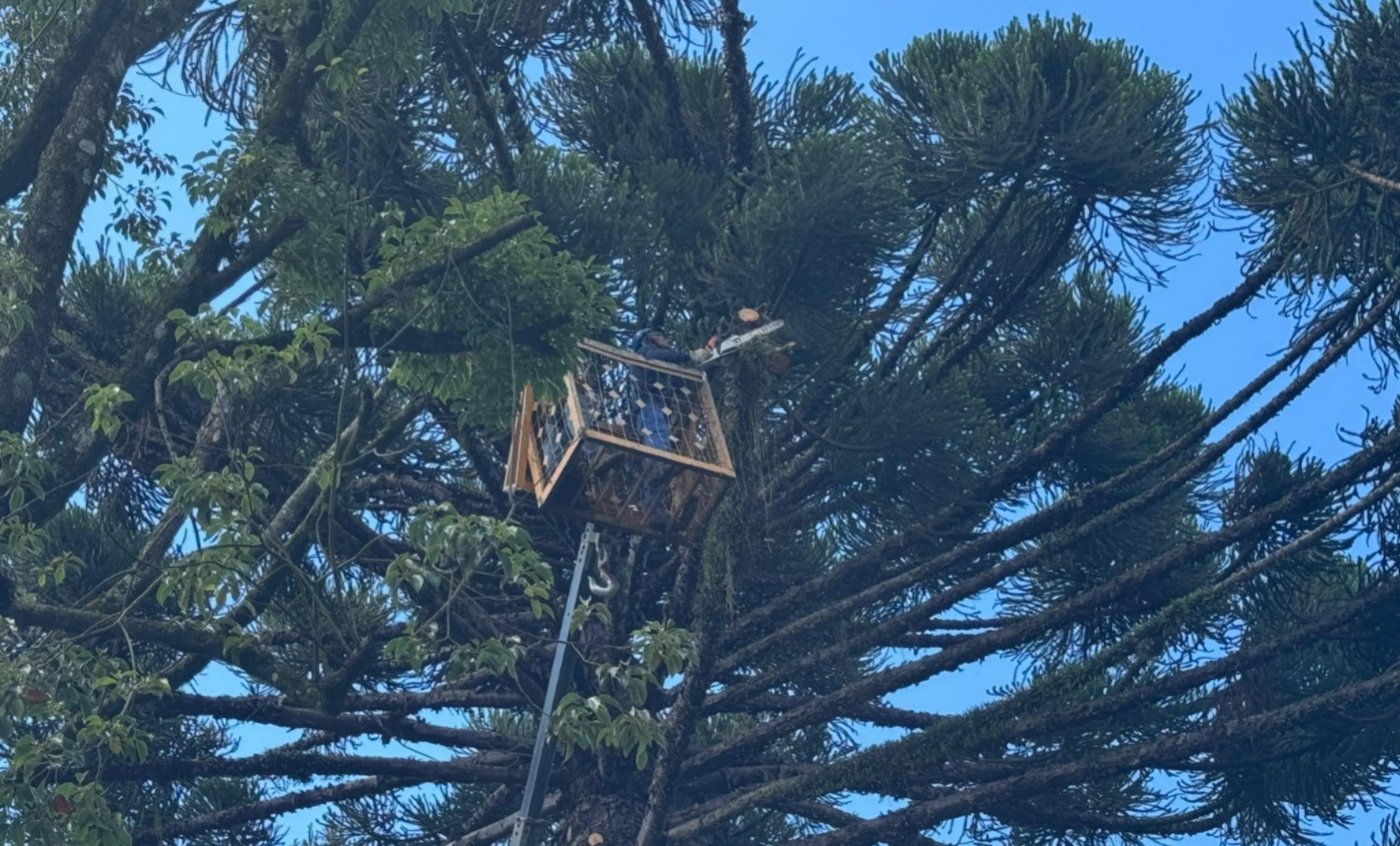Pelo princípio de precaução, realizou-se a manutenção com a retirada de parte dos galhos de Araucaria angustifolia (pinheiro-brasileiro), visando atender a necessidade recorrente de manutenção, tendo em vista a queda eventual de galhos como já ocorrido e relatado por servidores locais.