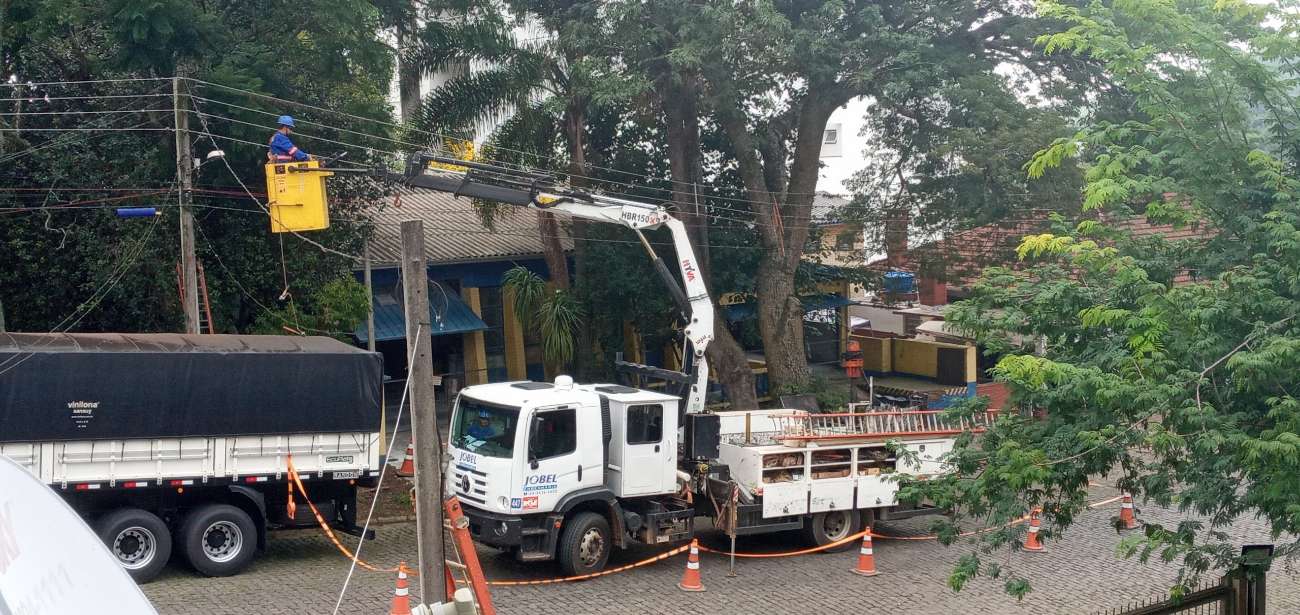 Equipe da Jobel Engenharia realiza manutenção e troca de poste na Rua Anselmo Sandi. Os trabalhos devem durar até perto de meio-dia.