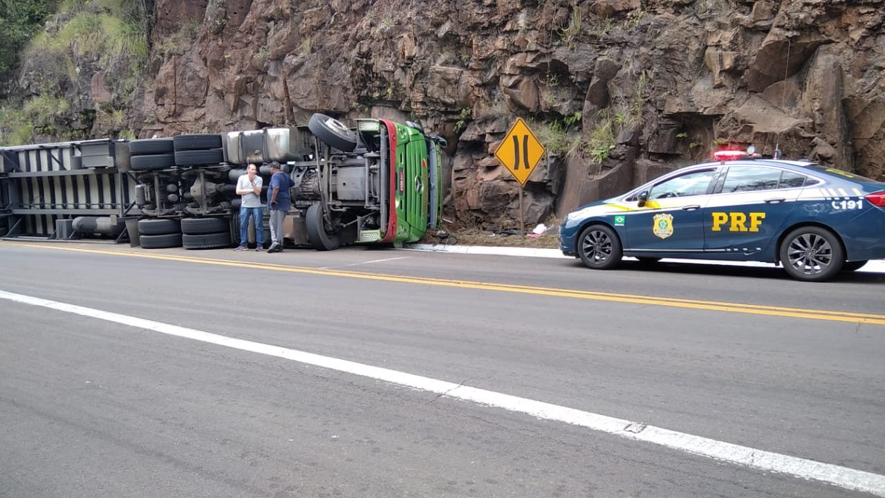 A carreta, com placas de São Marcos, era conduzida por um senhor de 52 anos, que sofreu ferimentos leves e recusou atendimento médico