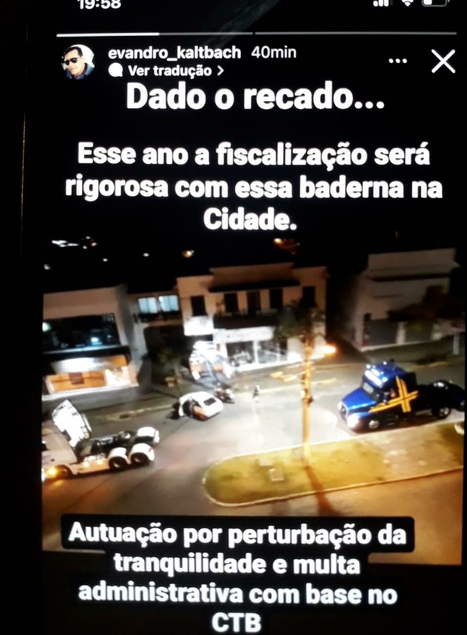 “Dado o recado… Esse ano a fiscalização será rigorosa com essa baderna na cidade. Autuação por perturbação da tranquilidade e multa administrativa com base no CTB”, escreveu Kaltbach, em postagem acompanhada de uma imagem de caminhões descendo a Avenida que, pelo ângulo, foi tirada de sua residência.