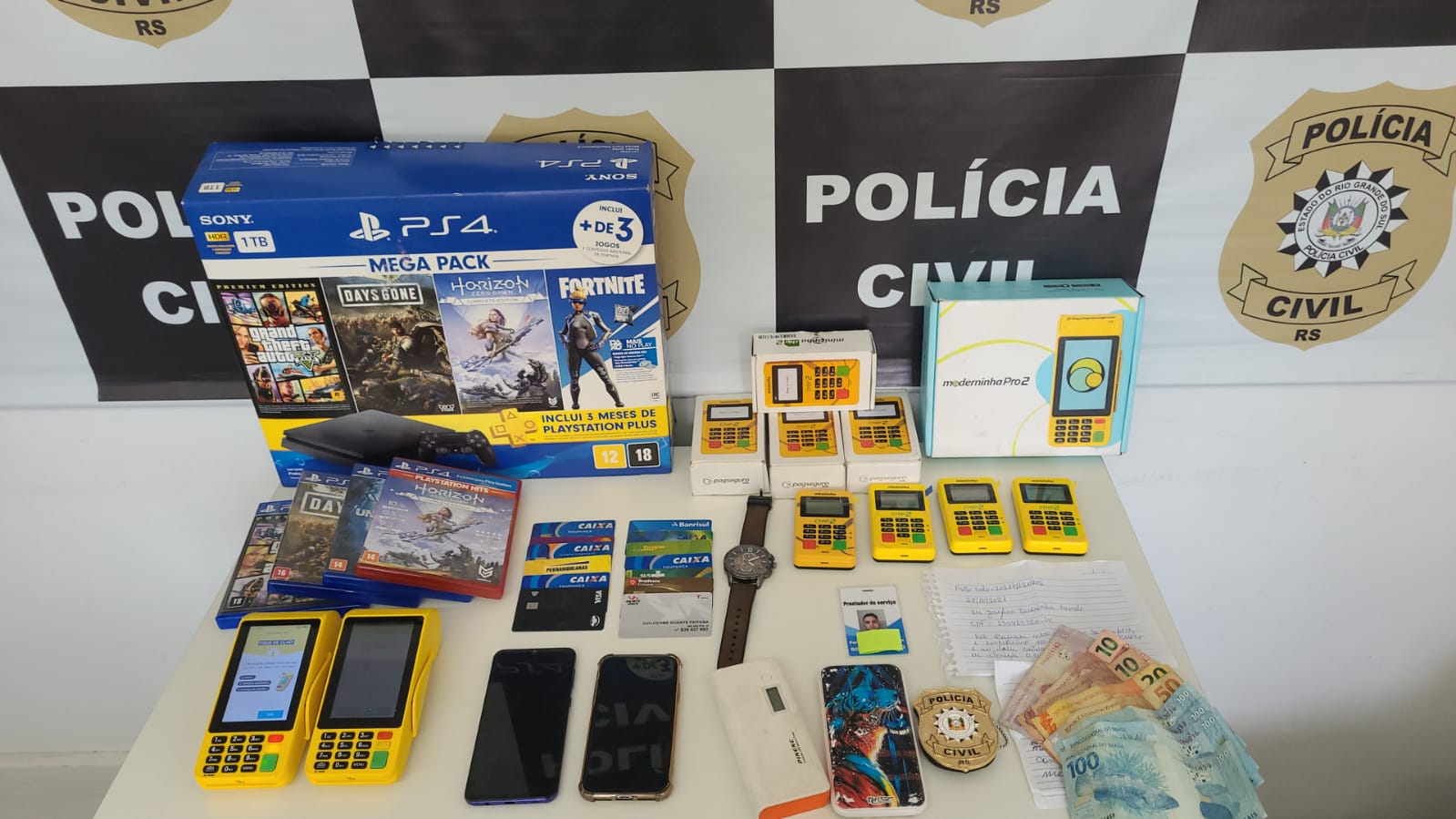 Juntamente com os presos, foram apreendidos inúmeros cartões bancários das vítimas, senhas, dinheiro, diversas máquinas de cartão de crédito/débito, crachá de identificação falsificado, veículo automotor utilizado para a prática do crime e um vídeo game avaliado em mais de R$ 2.000,00 (dois mil reais).