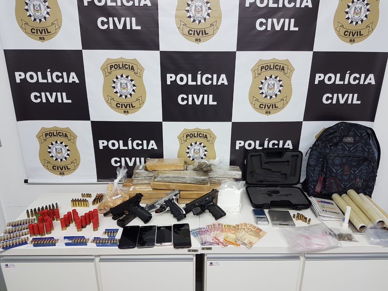 Restaram apreendidas 3 pistolas calibre .380, diversas munições, inclusive de calibre .12, mais de 12 kgs de 2maconha, 680 gramas de crack e 520 gramas de cocaína, mais de onze mil reais em dinheiro, além de inúmeros aparatos para separação e embalagem da droga.