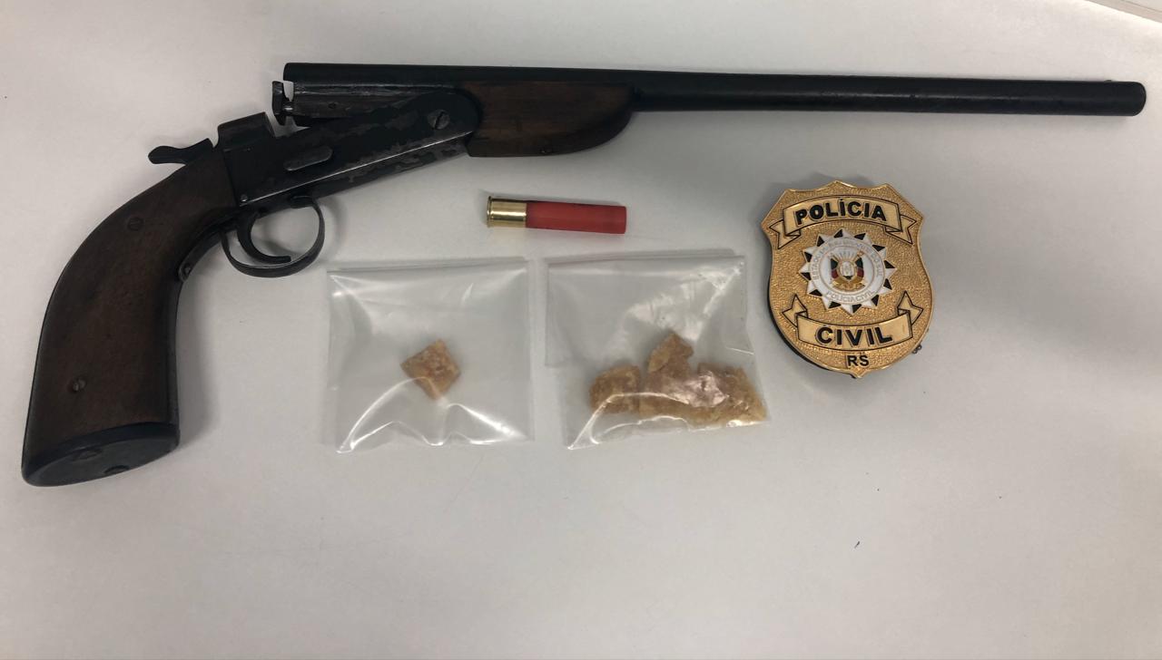 O indivíduo é investigado por tráfico de drogas e associação ao tráfico. No momento da abordagem, em via pública, foi apreendido junto ao acusado algumas pedras de crack e uma garrucha calibre .36, municiada, sendo o indivíduo autuado em flagrante pelos crimes de tráfico de drogas e porte ilegal de arma de fogo de uso permitido. Também restou apreendido o veículo que utilizava, em cumprimento de ordem judicial.