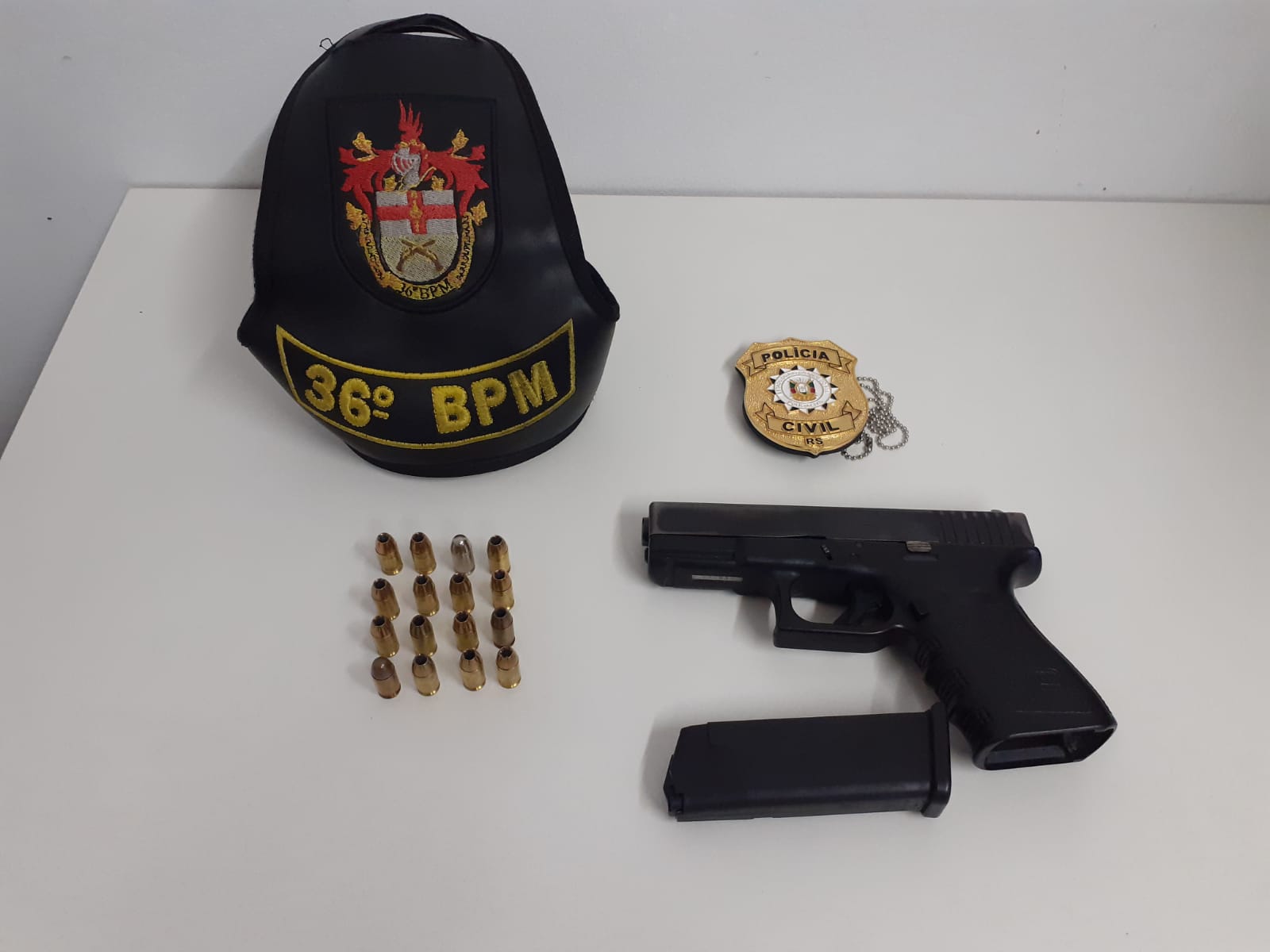 Foi realizada busca pessoal e veicular, no veículo Land Rover, dentro de uma sacola no banco traseiro, foi localizado uma pistola Glock G25 calibre .380 municiada com 16 munições, sendo que o proprietário possui registro da arma, mas não possui porte sendo assim foi conduzido a DP de São Marcos para o registro de porte ilegal de arma de cal permitido.