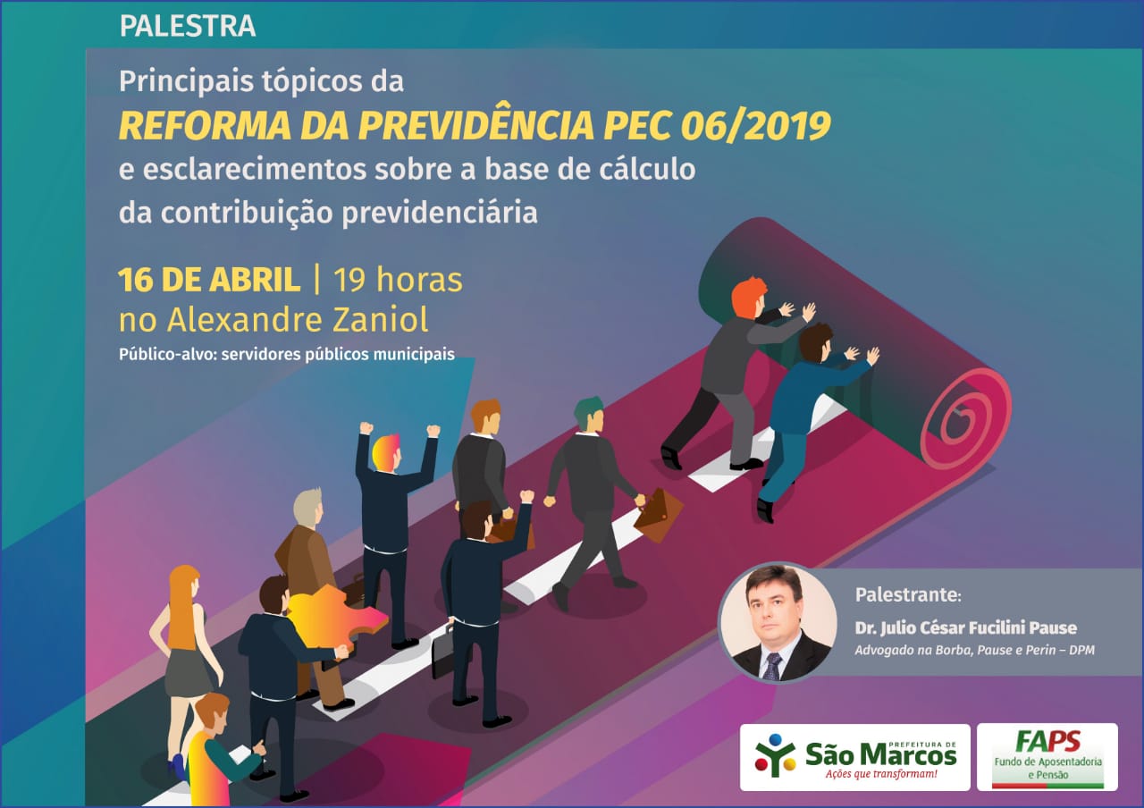 A Prefeitura Municipal e o FAPS -Fundo de Aposentadoria e Pensão dos Servidores, estão promovendo palestra destinada aos servidores públicos, objetivando informá-los sobre as mudanças propostas pela PEC 06/2019 nas regras de aposentadoria dos servidores públicos.