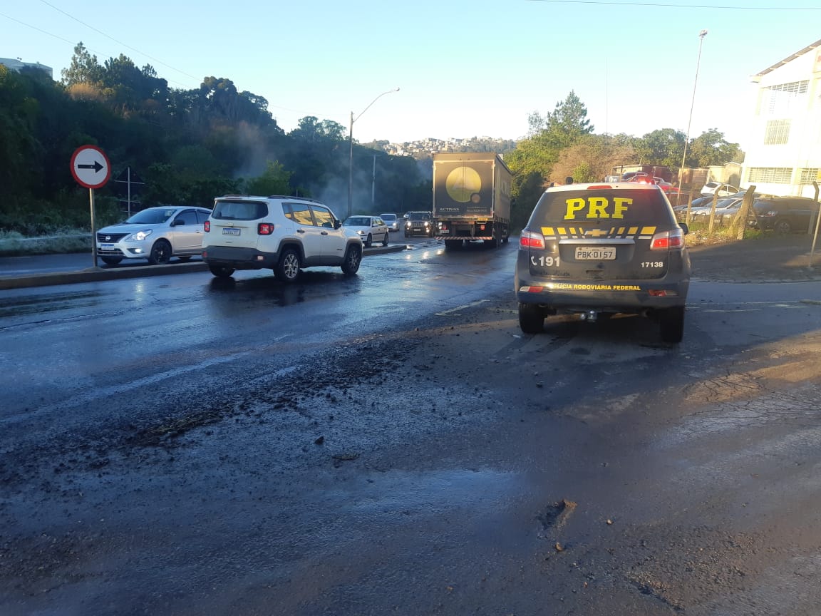 A pista está bastante escorregadia devido ao gelo, principalmente no sentido Ana Rech – Parada Cristal. A PRF realiza orientação de trânsito no local.