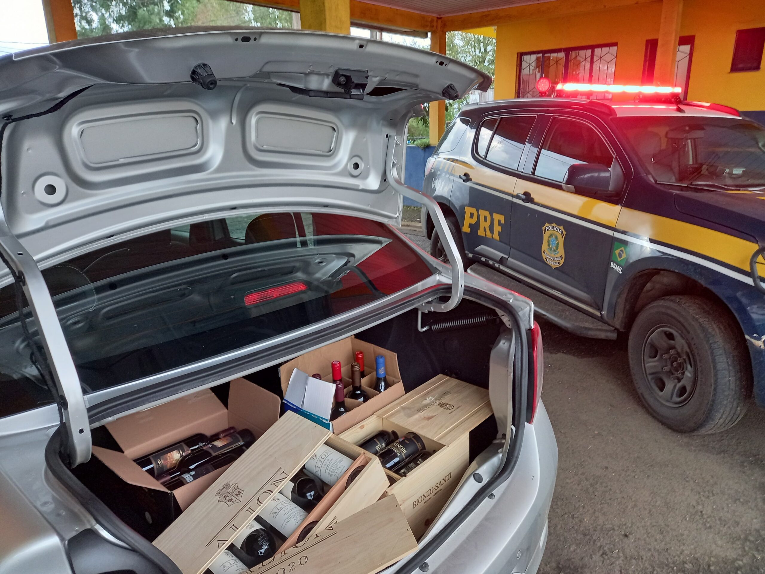 Numa ação de combate à criminalidade e crimes transfronteiriços, os PRFs abordaram um Logan com placas de São Paulo, que transitava entre Vacaria e Campestre da Serra. Ao verificar o porta-malas do veículo, os policiais constataram que ele transportava 83 garrafas de vinhos importados, que entraram no país sem o devido pagamento de impostos.