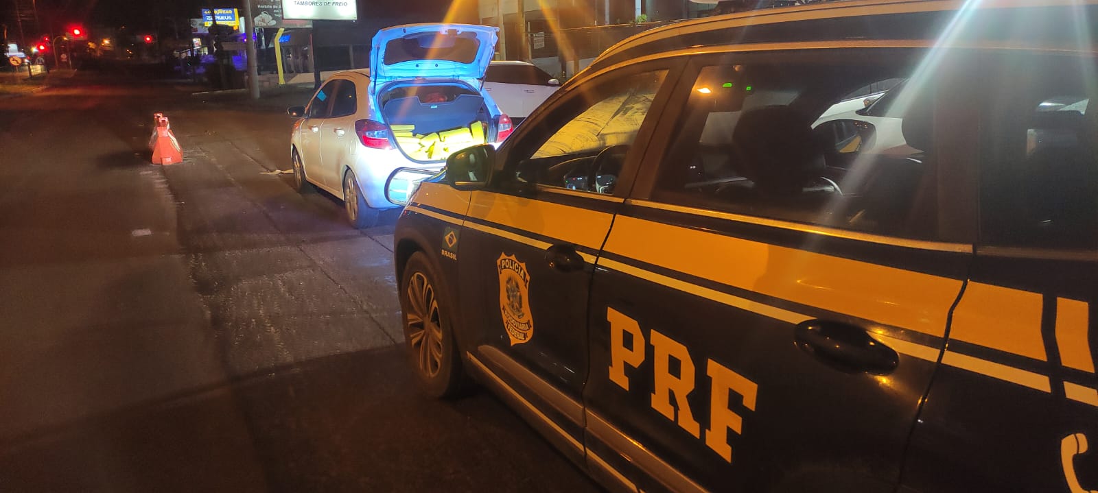 Na madrugada desta quinta-feira (06), a Polícia Rodoviária Federal prendeu um casal transportando 198 quilos de maconha em um ka que utilizava placas falsas. A ação ocorreu em Flores da Cunha.