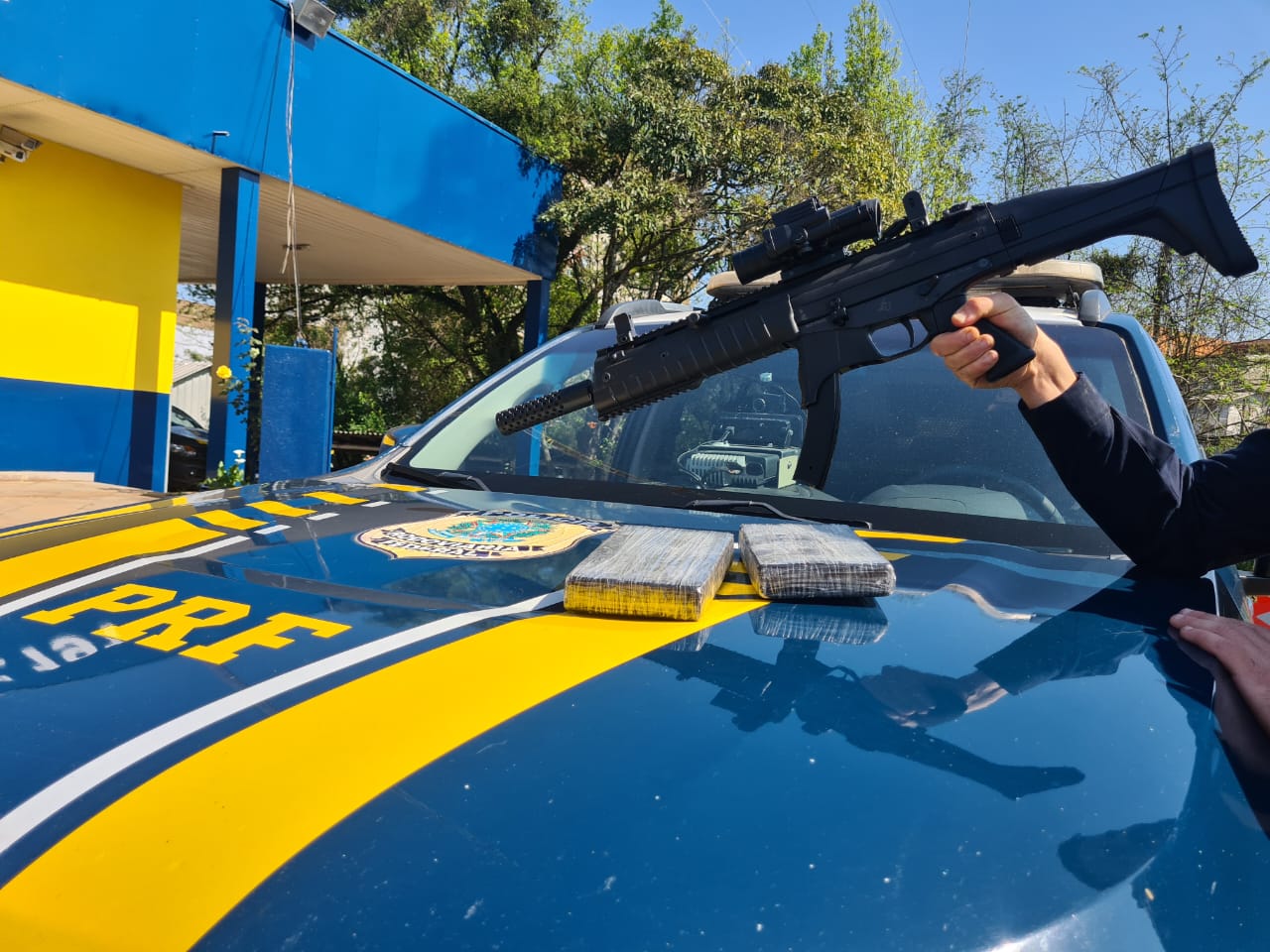 No interior do veículo, os agentes encontraram uma mala de transporte de armamento, na qual estava a carabina calibre 9mm com mira holográfica e dois tabletes de cocaína. O suspeito informou às autoridades que estava transportando a arma de fogo e a droga de Cascavel/PR para Cachoeirinha/RS.