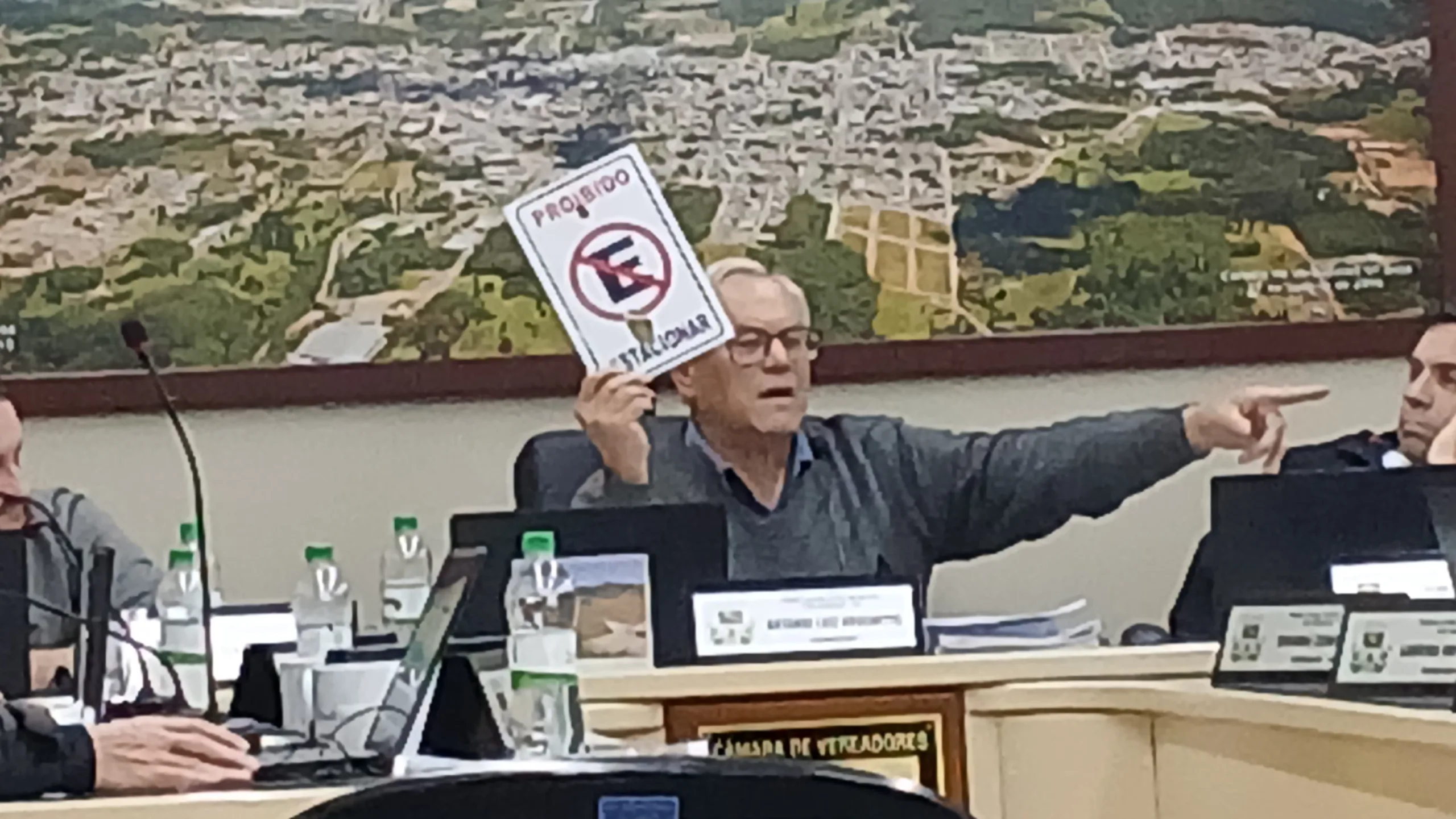 Durante suas explicações pessoais, Brochetto relatou um ato que classificou como “vandalismo” e “desrespeito”, atribuindo diretamente a Juca, que além de secretário, é vereador licenciado. Segundo ele, a placa, instalada a seu pedido pela Secretaria de Serviços Públicos, visava coibir o estacionamento na entrada da Câmara — espaço que tem um rebaixe na calçada, usado como acesso.