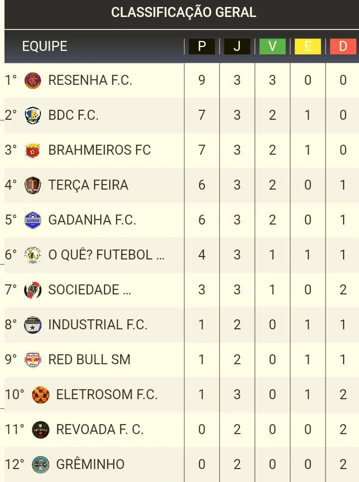 O Resenha lidera a competição com 9 pontos e está invicto até o momento, com três vitórias. Em segundo está o BDC, seguido por Brahmeiros, ambos com 7 pontos. Confira a classificação geral até a 4ª rodada e os jogos desta noite.