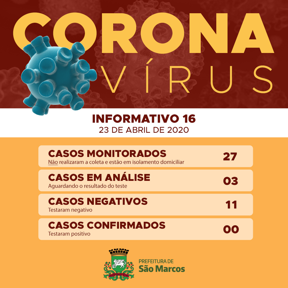 O resultado do exame recebido hoje foi negativo De acordo com o boletim epidemiológico de hoje (23), São Marcos registra 11 casos negativos para Coronavírus e outros três em análise (um encaminhado para análise no dia 21; outros dois encaminhados hoje).