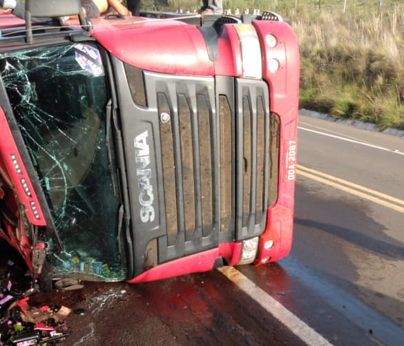 Condutor foi encaminhado ao Hospital São João Bosco para avaliação Por volta das 16h30 desta quarta-feira (17) um caminhão Scania carregado com vinho tombou na altura do km 78, em Campestre da Serra.