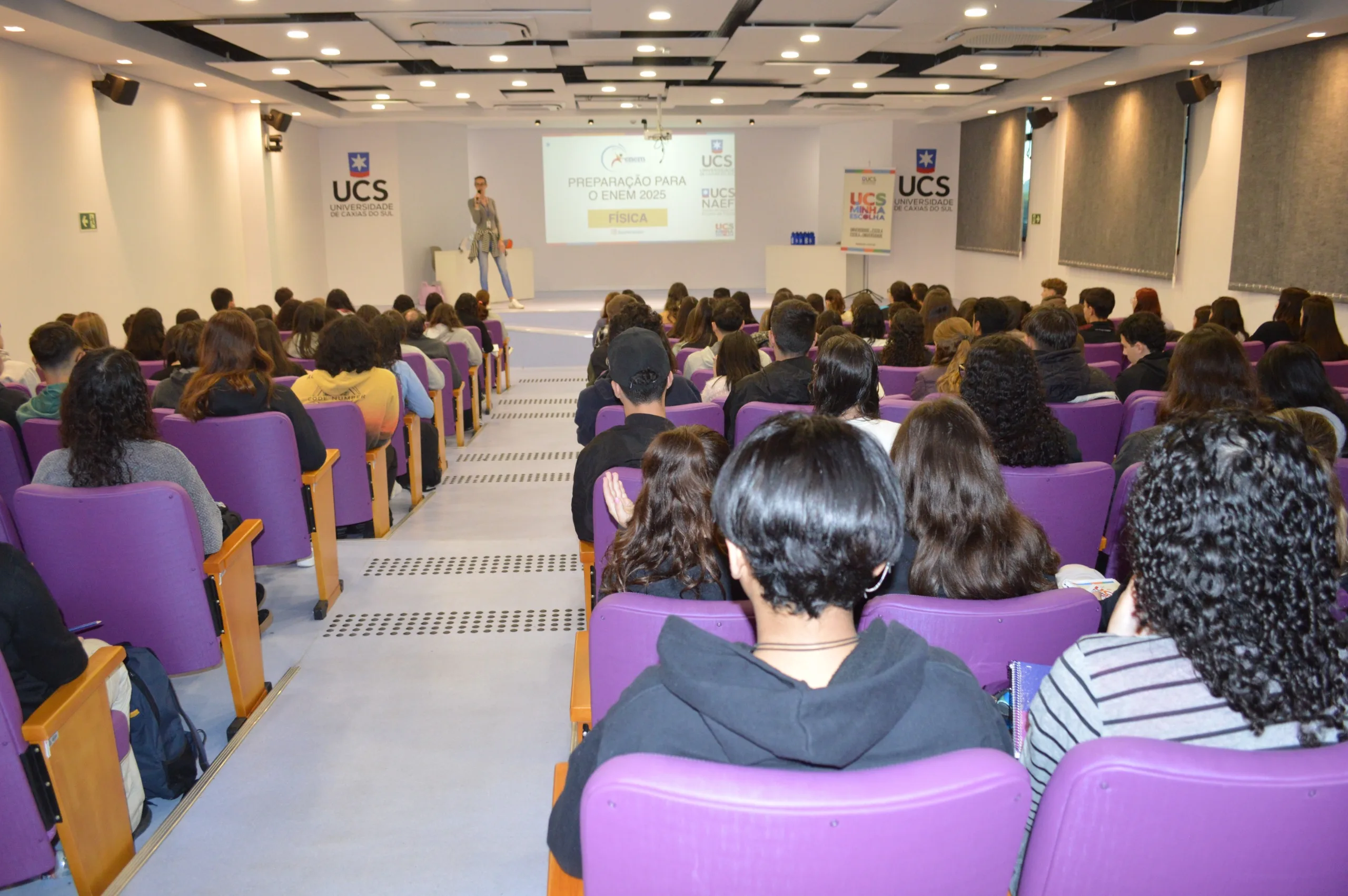 O projeto busca oferecer apoio pedagógico a estudantes que se preparam para o ENEM, contribuindo para a democratização do acesso ao Ensino Superior. A primeira aula deste ano, no dia 10 de maio, reuniu cerca de 210 estudantes. Eles foram recepcionados com um coffee break e brindes oferecidos por integrantes da Pró-Reitoria de Graduação e da equipe do UCS Minha Escolha, responsáveis pela promoção e execução do projeto, respectivamente. O ambiente acolhedor favoreceu a troca de experiências entre os participantes.