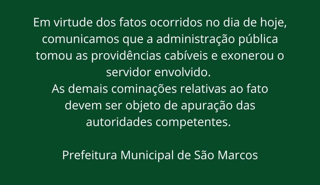 Diante da repercussão do caso, a Prefeitura Municipal de São Marcos emitiu uma nota oficial informando que o servidor foi exonerado do cargo. “A administração pública tomou as providências cabíveis e exonerou o servidor envolvido. As demais cominações relativas ao fato devem ser objeto de apuração das autoridades competentes”, declarou o comunicado.