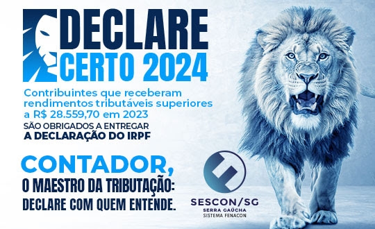 Uma campanha liderada pelo Sistema Fenacon, com apoio do Sescon Serra Gaúcha (Sindicato das Empresas de Serviços Contábeis e das Empresas de Assessoramento, Perícias, Informações e Pesquisas da Região Serrana do RS), busca esclarecer dúvidas sobre a declaração de rendimentos (IRPF) do exercício de 2024 e também destacar a importância da orientação do profissional contábil. Intitulada Declare Certo e com o slogan “Contador, o maestro da tributação: declare com quem entende”, a iniciativa inclui uma cartilha on-line com informações que poderá ser acessada pelo público interessado nos próximos dias.