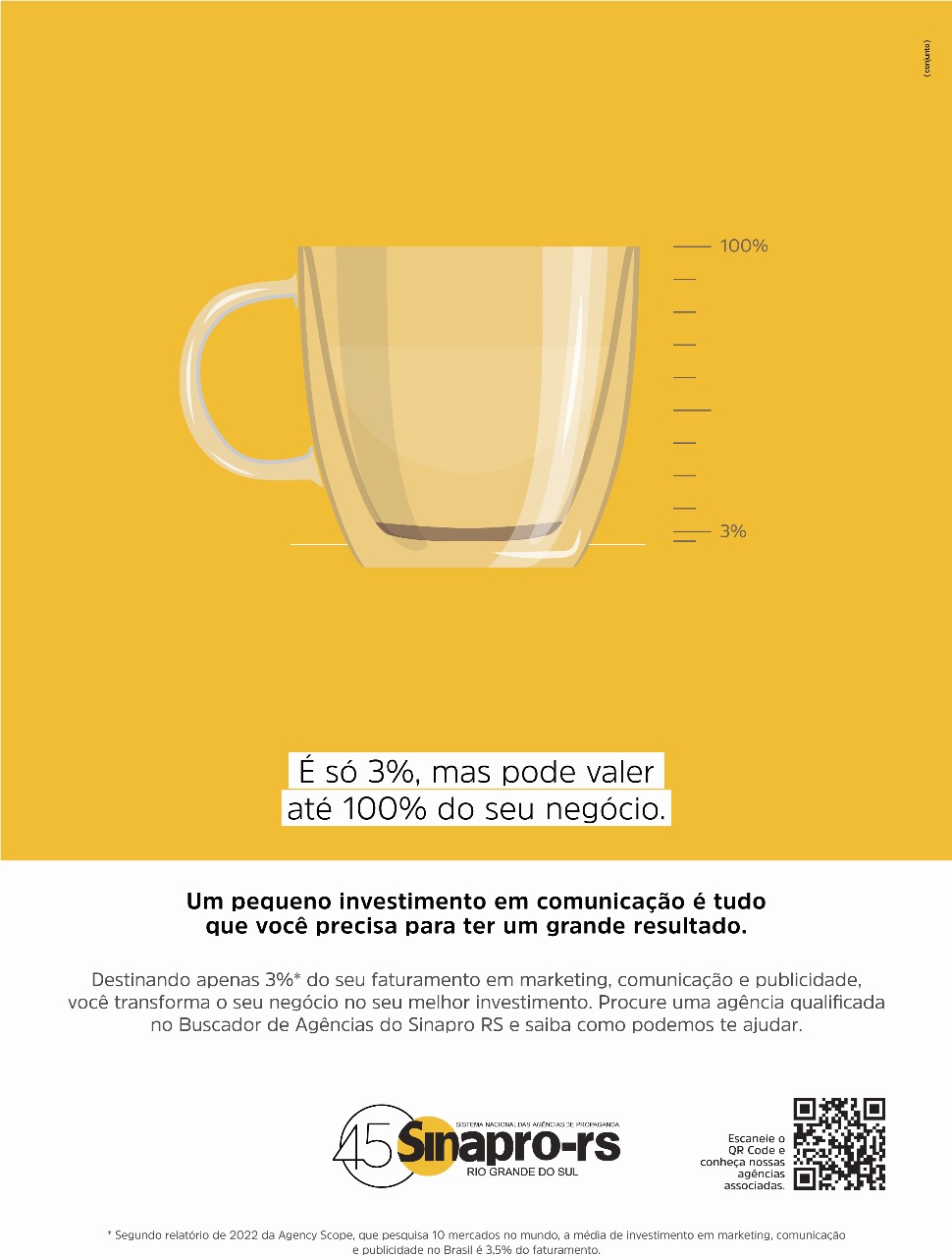 Assinada pela agência Conjunto, a iniciativa utiliza como mote para impactar a audiência “É só 3%, mas pode valer até 100% do seu negócio”, mostrando que com um pequeno investimento em comunicação tem-se grandes resultados. O índice de 3% do faturamento como indicador do percentual mínimo a ser investido é referenciado pela Agency Scope de 2022, que afere que as marcas bem-sucedidas atuantes no Brasil investem, em média, 3,5% da receita anual em marketing, comunicação e publicidade.
