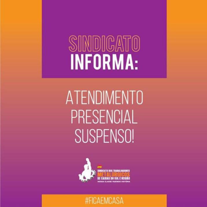 Seguindo as recomendações das autoridades no enfrentamento ao coronavírus, o Sindicato dos Metalúrgicos de São Marcos informa que a partir desta quinta-feira, dia 2 de abril, está suspenso o atendimento ao público, podendo se estender de acordo com novas orientações oficiais para o combate à pandemia. Apenas alguns departamentos irão funcionar para o trabalho interno do Sindicato.