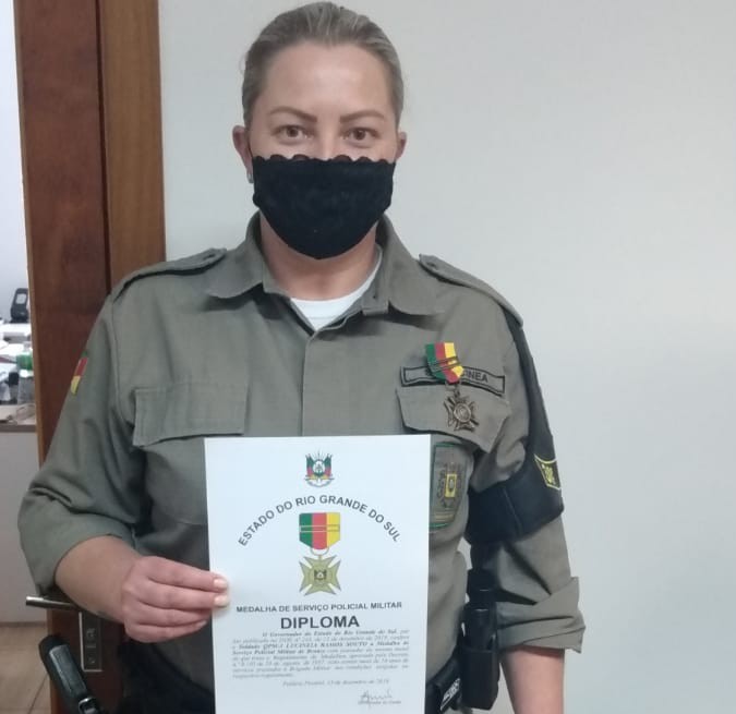 No pelotão de São Marcos a Sd. Souto recebeu medalha de bronze por seus 10 anos de serviços prestados Na manhã desta terça-feira (4) o comandante do 36° BPM, Ten Cel Marcio Uberti e o Sub Cmt, Maj Giovani Gomes, entregaram Medalhas ao efetivo do Batalhão, que compreende seis cidades da região.