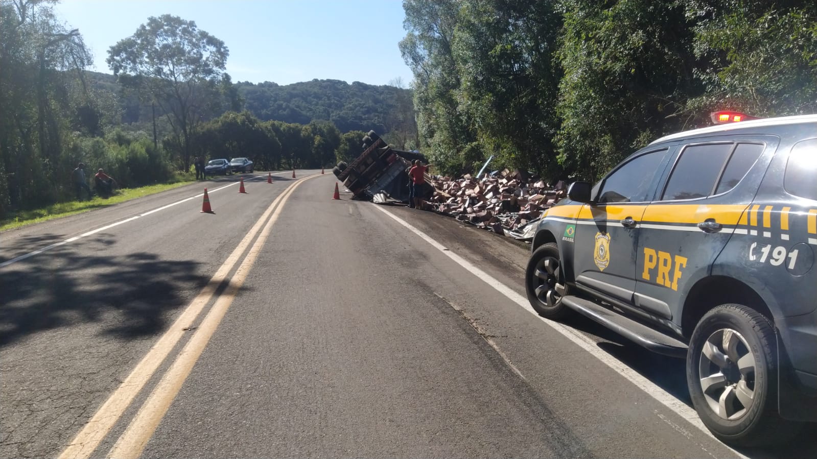 O veículo estava carregado de suco e seguia no sentido São Marcos – Campestre da Serra. Ao tombar o caminhão ficou sobre parte de um das pistas. O condutor não se feriu.