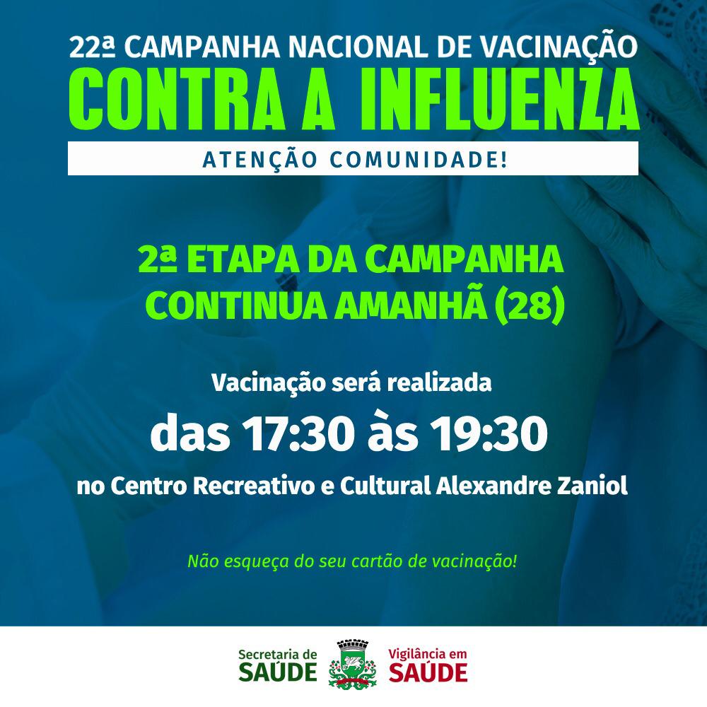 Ação não será em sistema de drive-thru e visa atender ao público que tem compromissos durante o horário habitual da campanha, como trabalhadores Onde? Centro de Eventos Alexandre Zaniol Público prioritário: Portadores de doenças crônicas; profissionais da segurança pública e salvamento; caminhoneiros e funcionários do transporte coletivo.