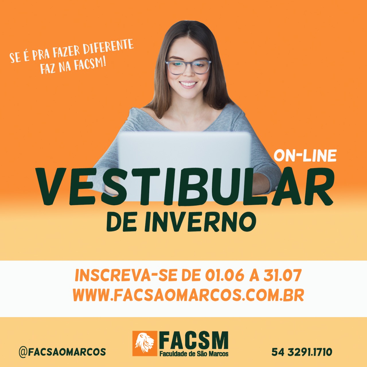 Inscrições seguem até fim do mês de julho Está aberto até 31 de julho o processo seletivo de inverno da Faculdade de São Marcos (Facsm). A novidade para este semestre é que o processo será feito totalmente on-line, devido o combate à Covid-19 do qual é proibido a aglomeração de pessoas.