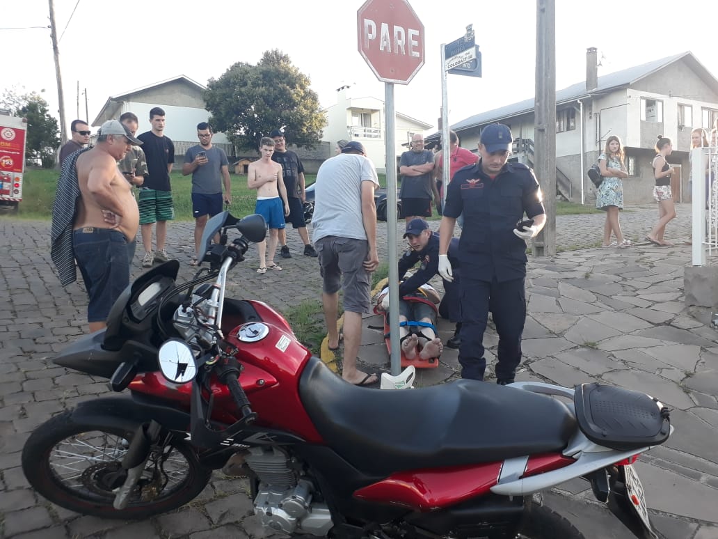 D.C; de 25 anos, ficou ferido após colidir em um automóvel Ford/Ka, na esquina das Ruas Alfredo de Lavra Pinto e Maringá, no bairro Francisco Doncatto (Tapejara). Soldados do Corpo de Bombeiros realizaram os primeiros socorros e imobilizaram a vítima.