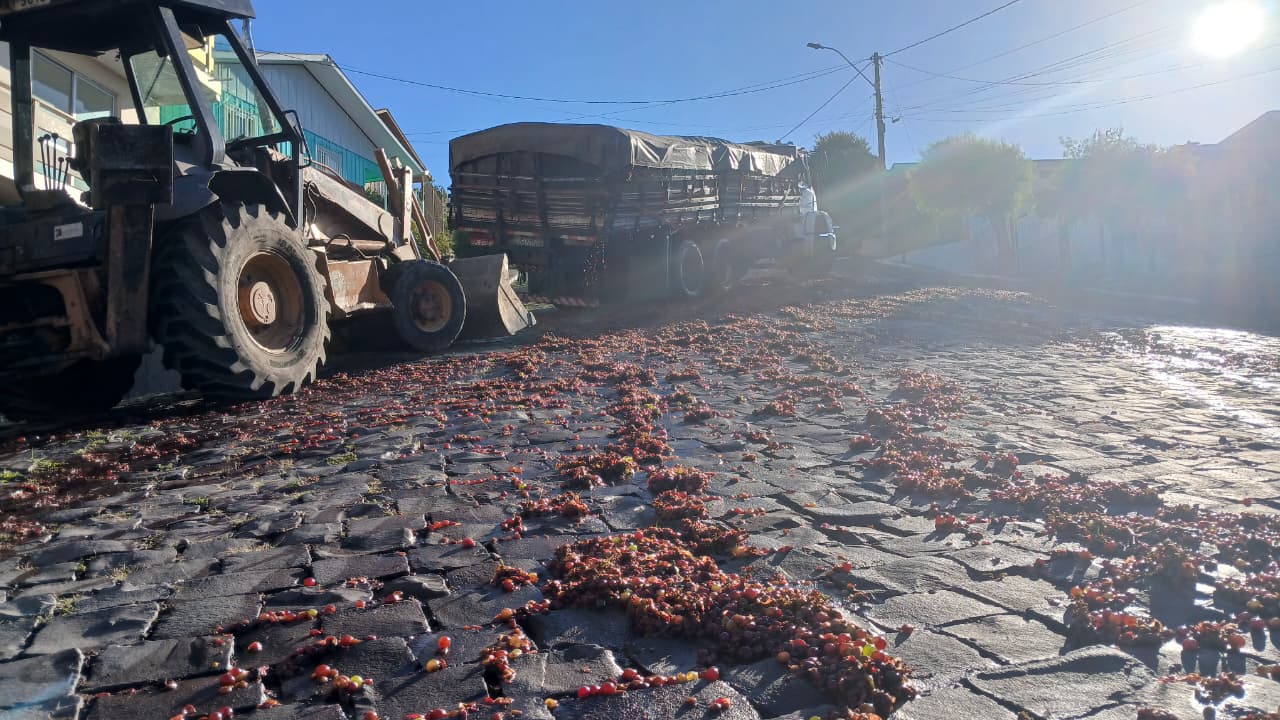 O caminhão, que estava “empacado”, precisou do apoio de duas máquinas da Secretaria Municipal de Obras, que auxiliaram tanto na remoção das uvas quanto na reorganização da carga remanescente. Servidores e equipes da Prefeitura também atuaram na retirada do material que ainda permanecia sobre o veículo.