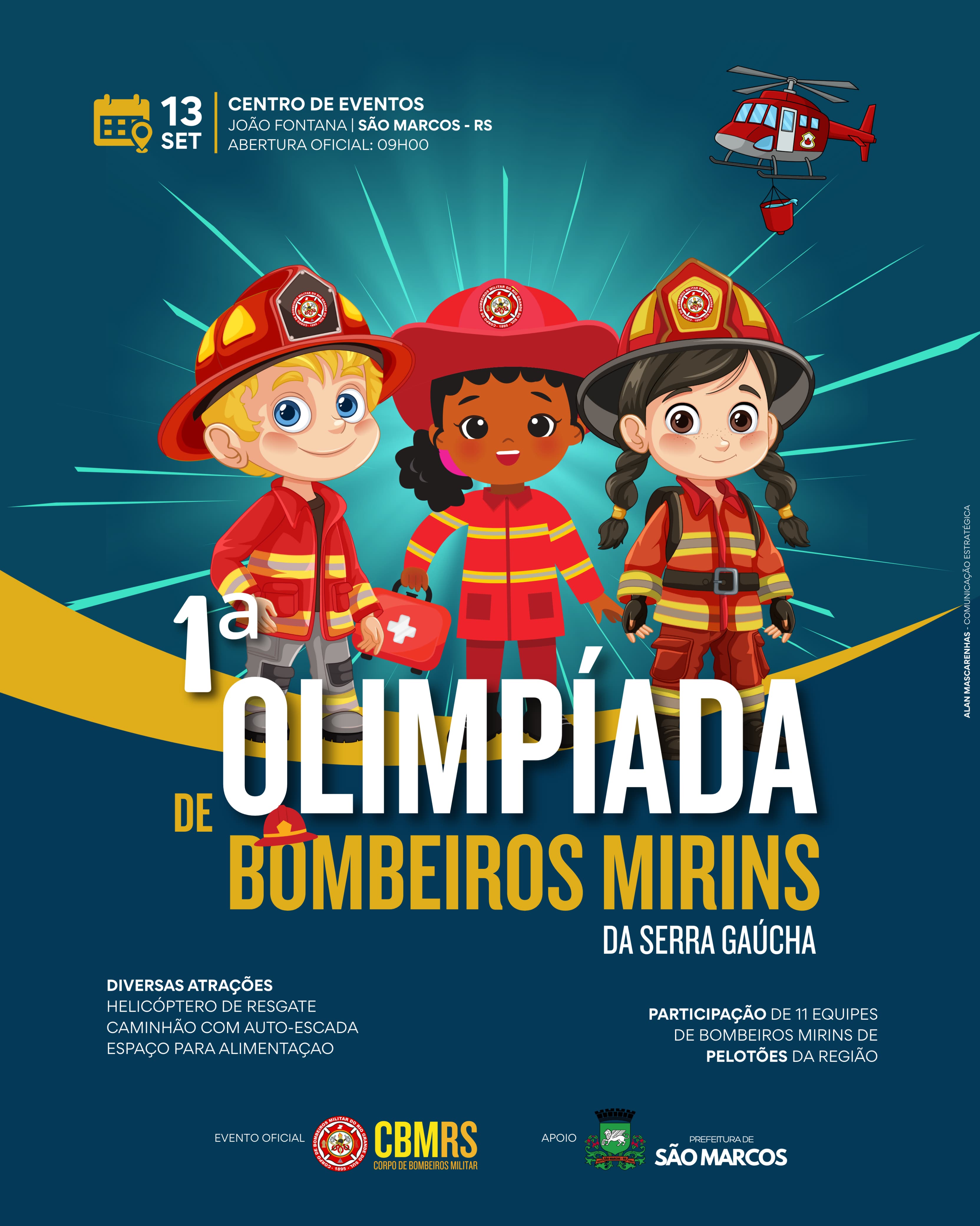 Neste sábado, 13 de setembro, São Marcos será palco da 1ª Olimpíada de Bombeiros Mirins, um evento inédito que promete movimentar o Centro de Eventos João Fontana. A abertura oficial está marcada para 9h, com protocolo militar e hasteamento das bandeiras, e a programação seguirá durante todo o dia, reunindo mais de 330 crianças inscritas no programa Bombeiro Mirim.